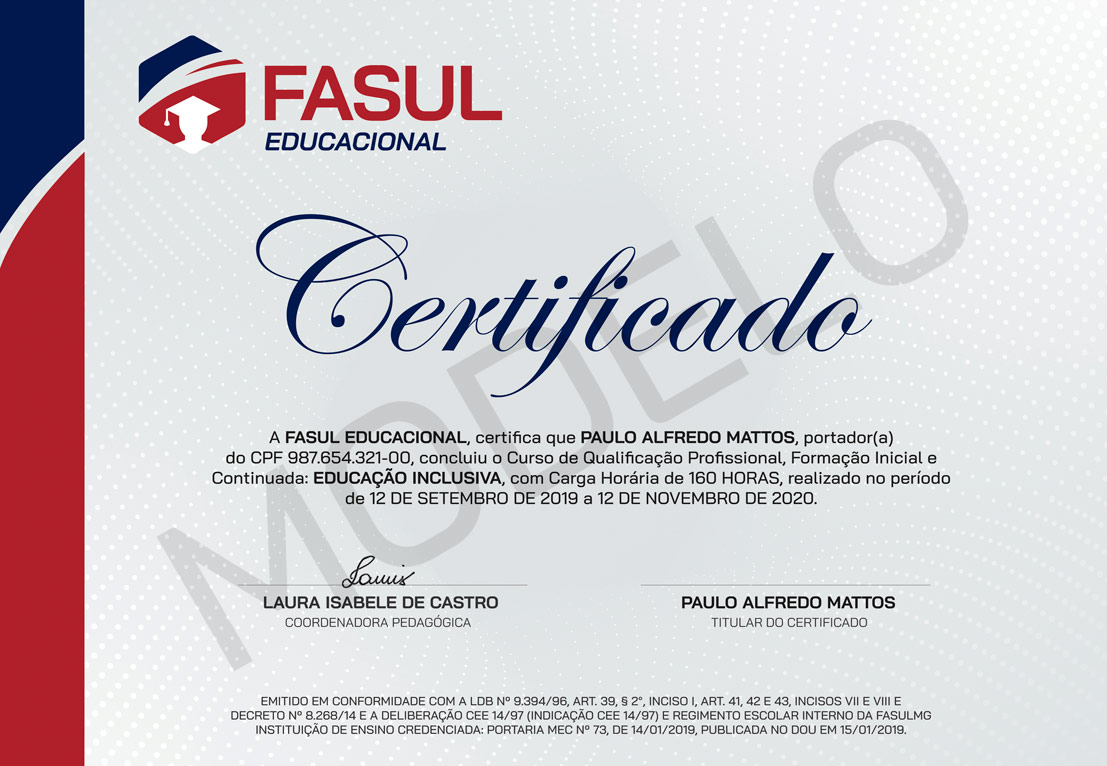 - NO VERSO DO CERTIFICADO, CONSTA O CONTEÚDO PROGRAMÁTICO COMPLETO DO CURSO, CARGA HORÁRIA, NOTA DE APROVEITAMENTO DO ALUNO, NÚMERO DE REGISTRO DO CERTIFICADO E QR CODE, QUE POSSIBILITA A CONFIRMAÇÃO DA AUTENTICIDADE DO CERTIFICADO. SEGUE ABAIXO O MODELO DO CERTIFICADO DOS CURSOS LIVRES ONLINE: